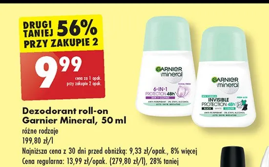 Cena produktu r贸偶ni si臋 w zale偶no艣ci od wybranego sklepu. Niestety nie posiadamy danych o aktualnych promocjach, jednak w艣r贸d archiwalnych ofert Dezodorant protection Garnier mineral invisible kosztuje od 7,99 z艂 do 12,99 z艂.