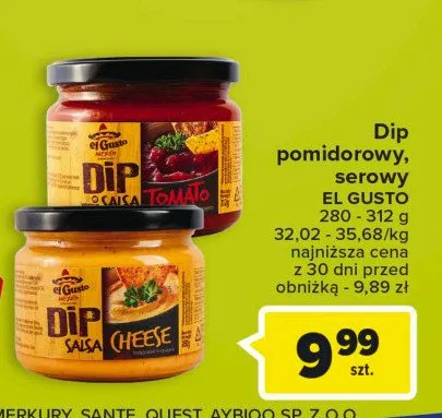Cena produktu r贸偶ni si臋 w zale偶no艣ci od wybranego sklepu. Niestety nie posiadamy danych o aktualnych promocjach, jednak w艣r贸d archiwalnych ofert Dip salsa tomato El gusto kosztuje od 9,59 z艂 do 9,99 z艂.