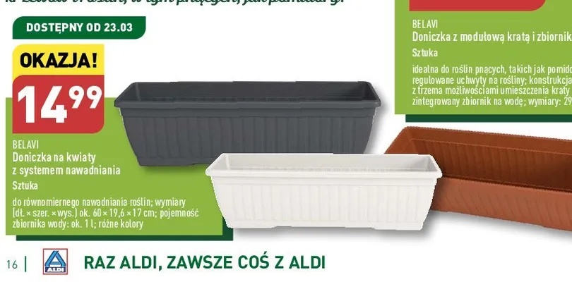Cena produktu r贸偶ni si臋 w zale偶no艣ci od wybranego sklepu. Niestety nie posiadamy danych o aktualnych promocjach, jednak w艣r贸d archiwalnych ofert Donicz z systemem nawadniania 60 x 19.6 x 17 cm BELAVI kosztuje od 14,99 z艂.