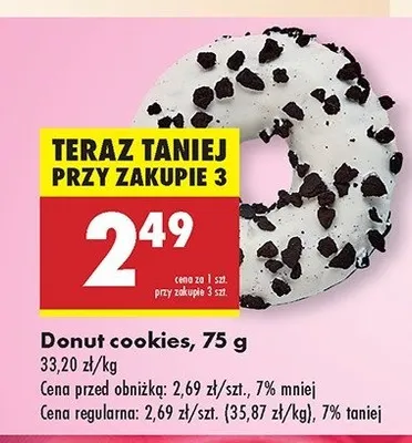 Cena produktu r贸偶ni si臋 w zale偶no艣ci od wybranego sklepu. Niestety nie posiadamy danych o aktualnych promocjach, jednak w艣r贸d archiwalnych ofert Donut cookies kosztuje od 2,39 z艂 do 3,33 z艂.