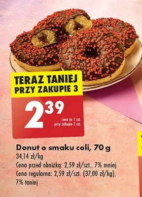 Cena produktu r贸偶ni si臋 w zale偶no艣ci od wybranego sklepu. Niestety nie posiadamy danych o aktualnych promocjach, jednak w艣r贸d archiwalnych ofert Donut o smaku coli kosztuje od 2,29 z艂 do 2,39 z艂.