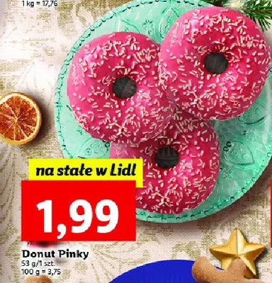 Cena produktu r贸偶ni si臋 w zale偶no艣ci od wybranego sklepu. Produkt Donut pinky mo偶esz kupi膰 w promocji ju偶 od 1,65 z艂. Najta艅sza oferta, jak膮 mamy w naszej bazie jest z sieci Lidl. Donut pinky kosztuje aktualnie 1,65 z艂. Zobacz ofert臋