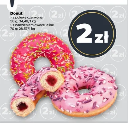 Cena produktu r贸偶ni si臋 w zale偶no艣ci od wybranego sklepu. Niestety nie posiadamy danych o aktualnych promocjach, jednak w艣r贸d archiwalnych ofert Donut z czerwon膮 polew膮 kosztuje od 1,19 z艂 do 2 z艂.