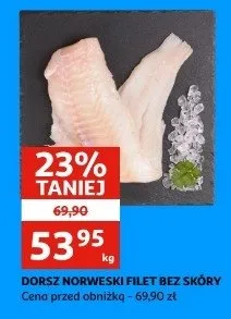 Cena produktu r贸偶ni si臋 w zale偶no艣ci od wybranego sklepu. Niestety nie posiadamy danych o aktualnych promocjach, jednak w艣r贸d archiwalnych ofert Dorsz norweski bez sk贸ry kosztuje od 49,99 z艂 do 57,99 z艂.