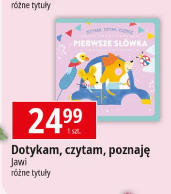 Cena produktu r贸偶ni si臋 w zale偶no艣ci od wybranego sklepu. Niestety nie posiadamy danych o aktualnych promocjach, jednak w艣r贸d archiwalnych ofert Dotykam, czytam, poznaj臋. moje pierwsze s艂贸wka Jawi kosztuje od 24,99 z艂.