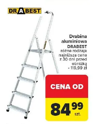 Cena produktu r贸偶ni si臋 w zale偶no艣ci od wybranego sklepu. Niestety nie posiadamy danych o aktualnych promocjach, jednak w艣r贸d archiwalnych ofert Drabina aluminiowa 5-stopniowa Drabest kosztuje od 69,99 z艂 do 119 z艂.