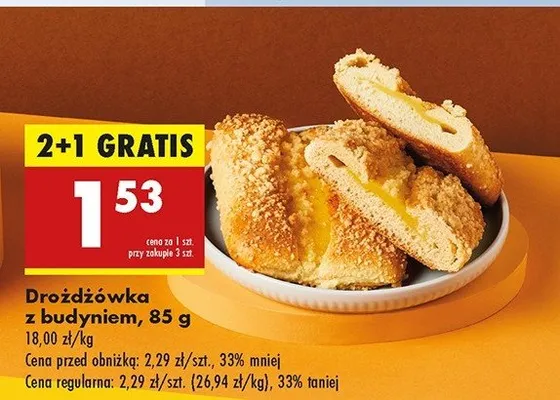 Cena produktu różni się w zależności od wybranego sklepu. Niestety nie posiadamy danych o aktualnych promocjach, jednak wśród archiwalnych ofert Droźdżówka z budyniem kosztuje od 1,53 zł do 2,09 zł.