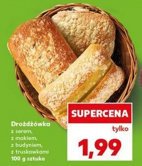 Cena produktu różni się w zależności od wybranego sklepu. Niestety nie posiadamy danych o aktualnych promocjach, jednak wśród archiwalnych ofert Drożdżówka z budyniem kosztuje od 1,89 zł do 2,39 zł.