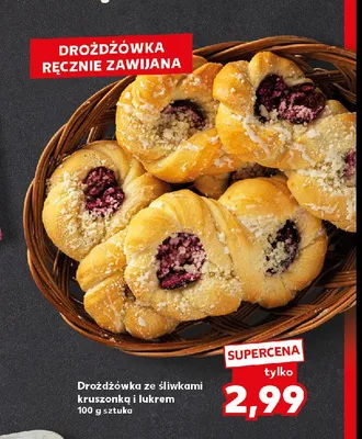 Cena produktu różni się w zależności od wybranego sklepu. Niestety nie posiadamy danych o aktualnych promocjach, jednak wśród archiwalnych ofert Drożdżówka ze śliwką kruszonką i lukrem kosztuje od 2,99 zł do 3,49 zł.