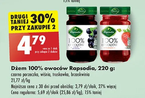 Zastanawiasz si臋, gdzie kupi膰 i ile kosztuje produkt D偶em truskawkowy Rapsodia? Regularnie sprawdzamy, czy jest promocja na ten produkt w Biedronka, Lidl, Kaufland, Auchan, Netto, Makro i innych sklepach. Aktualnie posiadamy 1 ofert臋 promocyjn膮 na ten produkt. Ceny zaczynaj膮 si臋 od 4,69z艂!