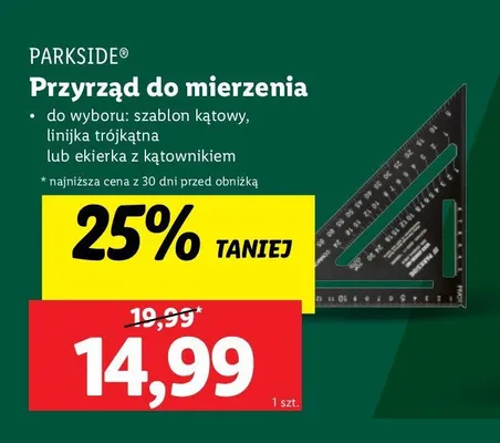 Cena produktu r贸偶ni si臋 w zale偶no艣ci od wybranego sklepu. Niestety nie posiadamy danych o aktualnych promocjach, jednak w艣r贸d archiwalnych ofert Ekierka z k膮townikiem Parkside kosztuje od 14,99 z艂 do 19,99 z艂.