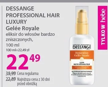 Cena produktu r贸偶ni si臋 w zale偶no艣ci od wybranego sklepu. Niestety nie posiadamy danych o aktualnych promocjach, jednak w艣r贸d archiwalnych ofert Eliksir do w艂os贸w bardzo zniszczonych Dessange hair luxury gelee royale kosztuje od 22,49 z艂 do 29,89 z艂.