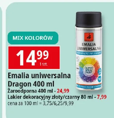 Cena produktu r贸偶ni si臋 w zale偶no艣ci od wybranego sklepu. Niestety nie posiadamy danych o aktualnych promocjach, jednak w艣r贸d archiwalnych ofert Emalia uniwersalna Dragon kosztuje od 10 z艂 do 17,99 z艂.