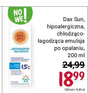 Cena produktu r贸偶ni si臋 w zale偶no艣ci od wybranego sklepu. Niestety nie posiadamy danych o aktualnych promocjach, jednak w艣r贸d archiwalnych ofert Emulsja do opalania z botanicznym mleczkiem spf30 Dax sun kosztuje od 18,99 z艂 do 21,99 z艂.