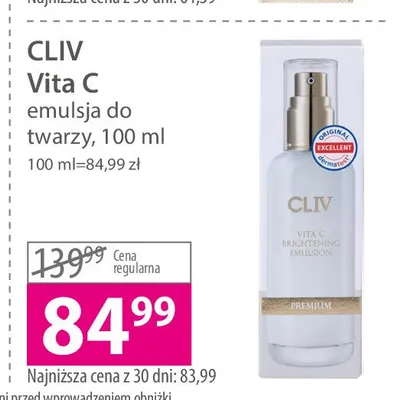 Cena produktu r贸偶ni si臋 w zale偶no艣ci od wybranego sklepu. Niestety nie posiadamy danych o aktualnych promocjach, jednak w艣r贸d archiwalnych ofert Emulsja do twarzy roz艣wietlaj膮ca CLIV VITA C kosztuje od 84,99 z艂.