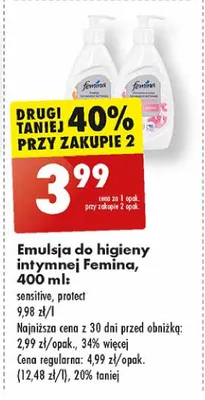 Cena produktu r贸偶ni si臋 w zale偶no艣ci od wybranego sklepu. Niestety nie posiadamy danych o aktualnych promocjach, jednak w艣r贸d archiwalnych ofert Emulsja ochronna Femina intimea kosztuje od 2,4 z艂 do 3,99 z艂.