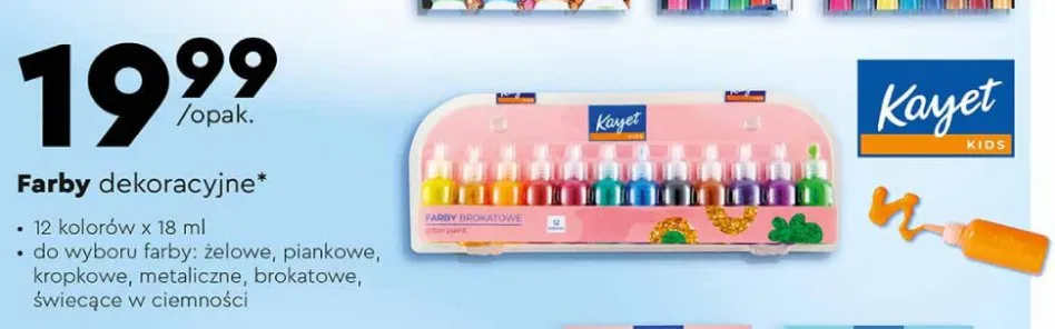 Cena produktu r贸偶ni si臋 w zale偶no艣ci od wybranego sklepu. Niestety nie posiadamy danych o aktualnych promocjach, jednak w艣r贸d archiwalnych ofert Farby piankowe Kayet kosztuje od 19,99 z艂.