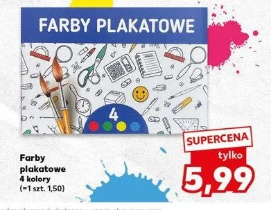 Cena produktu r贸偶ni si臋 w zale偶no艣ci od wybranego sklepu. Produkt Farby plakatowe mo偶esz kupi膰 w promocji ju偶 od 11,99 z艂. Najta艅sza oferta, jak膮 mamy w naszej bazie jest z sieci Biedronka. Farby plakatowe kosztuje aktualnie 11,99 z艂. Zobacz ofert臋