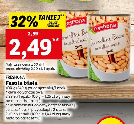 Cena produktu r贸偶ni si臋 w zale偶no艣ci od wybranego sklepu. Niestety nie posiadamy danych o aktualnych promocjach, jednak w艣r贸d archiwalnych ofert Fasola bia艂a Freshona kosztuje od 2,49 z艂.