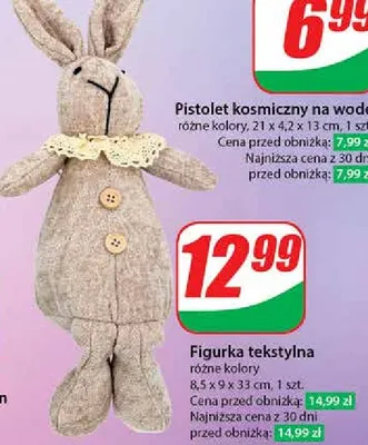 Cena produktu r贸偶ni si臋 w zale偶no艣ci od wybranego sklepu. Niestety nie posiadamy danych o aktualnych promocjach, jednak w艣r贸d archiwalnych ofert Figurka tekstylna zaj膮c kosztuje od 12,99 z艂.