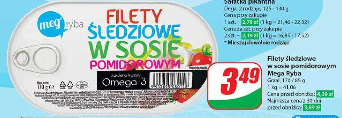 Cena produktu r贸偶ni si臋 w zale偶no艣ci od wybranego sklepu. Niestety nie posiadamy danych o aktualnych promocjach, jednak w艣r贸d archiwalnych ofert Filet 艣ledziowy w sosie pomidorowym Meg kosztuje od 3,14 z艂 do 3,69 z艂.