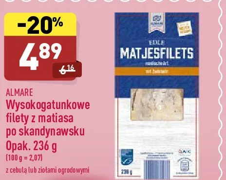 Cena produktu r贸偶ni si臋 w zale偶no艣ci od wybranego sklepu. Niestety nie posiadamy danych o aktualnych promocjach, jednak w艣r贸d archiwalnych ofert Filety po skandynawsku z zio艂ami ogrodowymi Almare seafood kosztuje od 4,89 z艂.