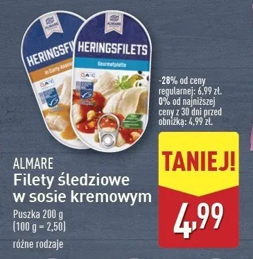 Cena produktu r贸偶ni si臋 w zale偶no艣ci od wybranego sklepu. Niestety nie posiadamy danych o aktualnych promocjach, jednak w艣r贸d archiwalnych ofert Filety 艣ledziowe w sosie kremowym Almare seafood kosztuje od 4,99 z艂 do 5,19 z艂.
