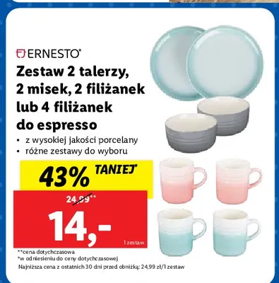 Cena produktu r贸偶ni si臋 w zale偶no艣ci od wybranego sklepu. Niestety nie posiadamy danych o aktualnych promocjach, jednak w艣r贸d archiwalnych ofert Fili偶anki do espresso Ernesto kosztuje od 14 z艂.