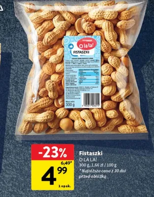 Zastanawiasz si臋, gdzie kupi膰 i ile kosztuje produkt Fistaszki O la la!? Regularnie sprawdzamy, czy jest promocja na ten produkt w Biedronka, Lidl, Kaufland, Auchan, Netto, Makro i innych sklepach. Aktualnie posiadamy 1 ofert臋 promocyjn膮 na ten produkt. Ceny zaczynaj膮 si臋 od 7,89z艂!
