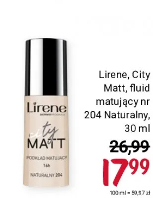 Cena produktu r贸偶ni si臋 w zale偶no艣ci od wybranego sklepu. Niestety nie posiadamy danych o aktualnych promocjach, jednak w艣r贸d archiwalnych ofert Fluid matuj膮cy naturalny 204 Lirene city matt kosztuje od 16,99 z艂 do 17,99 z艂.