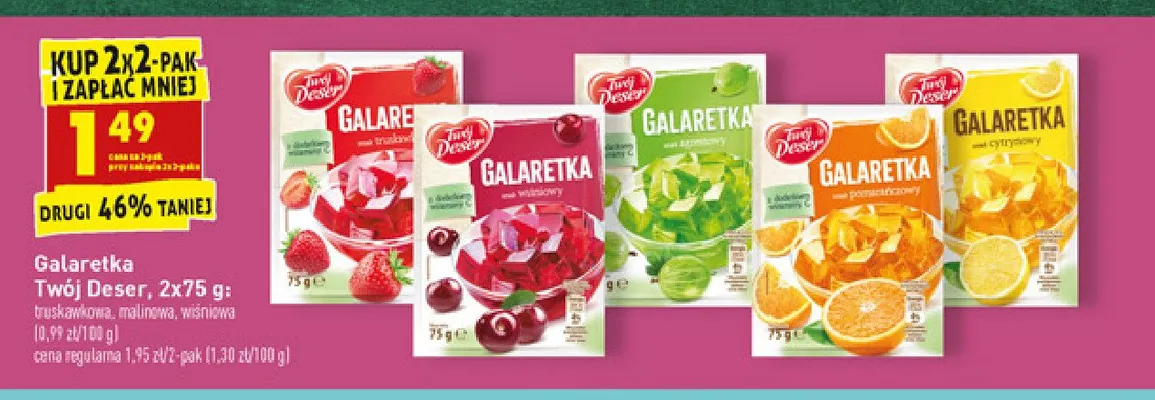 Cena produktu r贸偶ni si臋 w zale偶no艣ci od wybranego sklepu. Niestety nie posiadamy danych o aktualnych promocjach, jednak w艣r贸d archiwalnych ofert Galaretka malinowa Tw贸j deser kosztuje od 1,49 z艂.