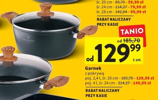 Cena produktu r贸偶ni si臋 w zale偶no艣ci od wybranego sklepu. Niestety nie posiadamy danych o aktualnych promocjach, jednak w艣r贸d archiwalnych ofert Garnek z pokryw膮 impact 24 cm Valdinox kosztuje od 149,99 z艂.