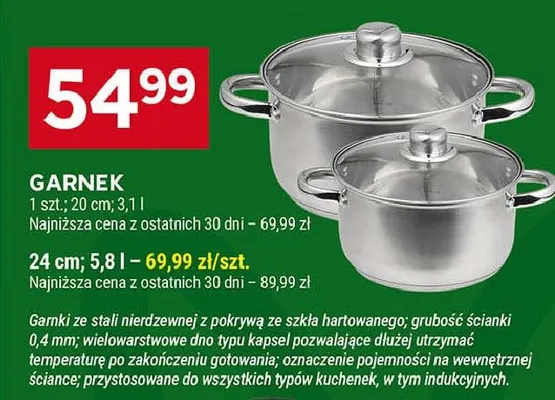 Cena produktu r贸偶ni si臋 w zale偶no艣ci od wybranego sklepu. Produkt Garnek z pokrywk膮 5.8 l mo偶esz kupi膰 w promocji ju偶 . Najta艅sza oferta, jak膮 mamy w naszej bazie jest z sieci Selgros. Garnek z pokrywk膮 5.8 l kosztuje aktualnie . Zobacz ofert臋