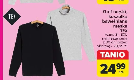 Cena produktu r贸偶ni si臋 w zale偶no艣ci od wybranego sklepu. Niestety nie posiadamy danych o aktualnych promocjach, jednak w艣r贸d archiwalnych ofert Golf m臋ski rozm. s-3xl Tex kosztuje od 24,99 z艂 do 59,99 z艂.