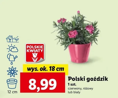 Cena produktu różni się w zależności od wybranego sklepu. Niestety nie posiadamy danych o aktualnych promocjach, jednak wśród archiwalnych ofert Goździk wys. 18 cm różowy kosztuje od 8,99 zł.