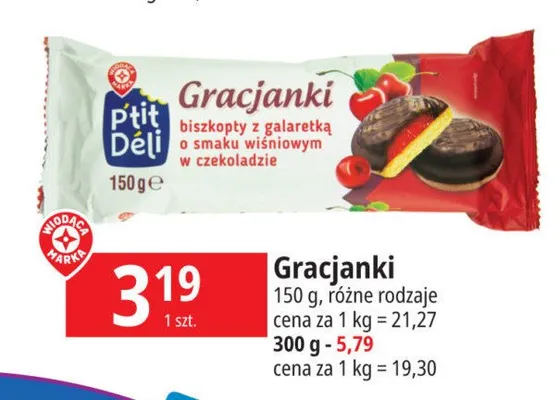 Cena produktu r贸偶ni si臋 w zale偶no艣ci od wybranego sklepu. Niestety nie posiadamy danych o aktualnych promocjach, jednak w艣r贸d archiwalnych ofert Gracjanki wi艣niowe Wiod膮ca marka p'tit deli kosztuje od 3,19 z艂 do 5,79 z艂.