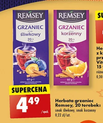 Cena produktu r贸偶ni si臋 w zale偶no艣ci od wybranego sklepu. Niestety nie posiadamy danych o aktualnych promocjach, jednak w艣r贸d archiwalnych ofert Grzaniec korzenny Remsey kosztuje od 3,99 z艂 do 4,49 z艂.