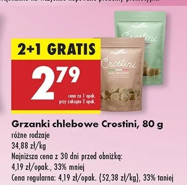 Cena produktu r贸偶ni si臋 w zale偶no艣ci od wybranego sklepu. Niestety nie posiadamy danych o aktualnych promocjach, jednak w艣r贸d archiwalnych ofert Grzanki 艣r贸dziemnomorskie Unigriss crostini kosztuje od 2,79 z艂 do 3,49 z艂.