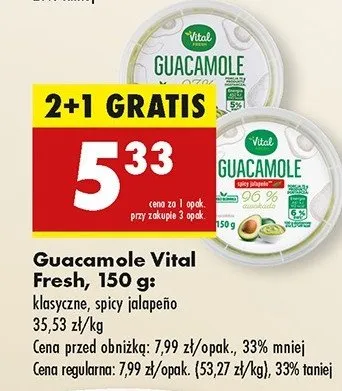 Cena produktu r贸偶ni si臋 w zale偶no艣ci od wybranego sklepu. Niestety nie posiadamy danych o aktualnych promocjach, jednak w艣r贸d archiwalnych ofert Guacamole Vital fresh kosztuje od 4 z艂 do 5,99 z艂.