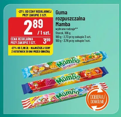 Cena produktu r贸偶ni si臋 w zale偶no艣ci od wybranego sklepu. Produkt Guma rozpuszczalna Mamba fun park mo偶esz kupi膰 w promocji ju偶 od 2,79 z艂 do 2,99 z艂. Najta艅sza oferta, jak膮 mamy w naszej bazie jest z sieci Biedronka. Guma rozpuszczalna Mamba fun park kosztuje aktualnie 2,79 z艂. Zobacz ofert臋