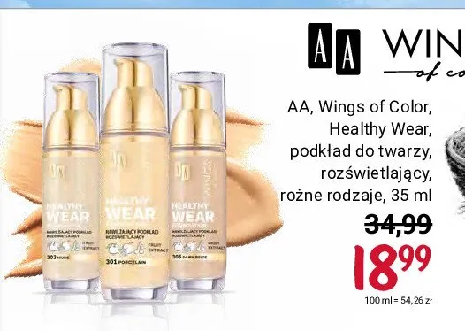 Cena produktu różni się w zależności od wybranego sklepu. Niestety nie posiadamy danych o aktualnych promocjach, jednak wśród archiwalnych ofert Healthy wear, nawilżający podkład rozświetlający 301 porcelain Aa wings of color kosztuje od 18,99 zł.