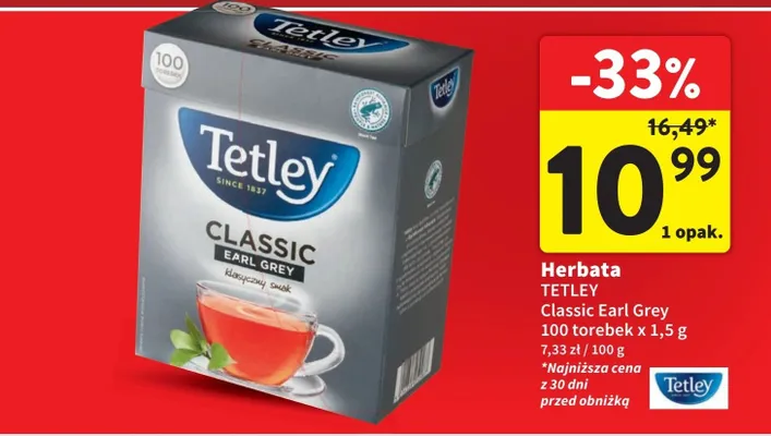 Cena produktu r贸偶ni si臋 w zale偶no艣ci od wybranego sklepu. Niestety nie posiadamy danych o aktualnych promocjach, jednak w艣r贸d archiwalnych ofert Herbata earl grey Tetley classic kosztuje od 5,89 z艂 do 15,49 z艂.
