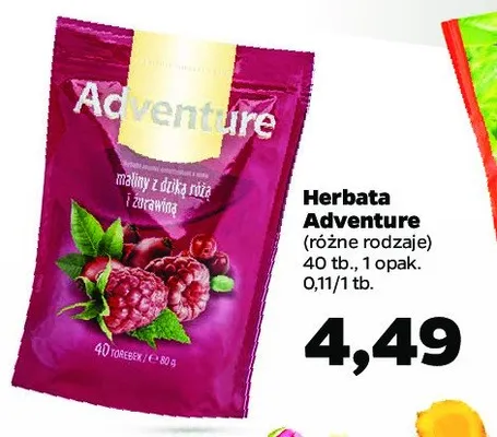 Cena produktu różni się w zależności od wybranego sklepu. Niestety nie posiadamy danych o aktualnych promocjach, jednak wśród archiwalnych ofert Herbata maliny z dziką różą i żurwiną Adventure kosztuje od 2,89 zł do 4,49 zł.