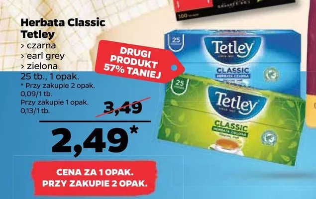 Cena produktu r贸偶ni si臋 w zale偶no艣ci od wybranego sklepu. Niestety nie posiadamy danych o aktualnych promocjach, jednak w艣r贸d archiwalnych ofert Herbata zielona Tetley classic kosztuje od 2,49 z艂.