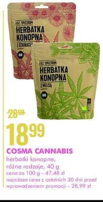 Cena produktu r贸偶ni si臋 w zale偶no艣ci od wybranego sklepu. Niestety nie posiadamy danych o aktualnych promocjach, jednak w艣r贸d archiwalnych ofert Herbatka konopna z melis膮 FULL SPECTRUM kosztuje od 18,99 z艂.