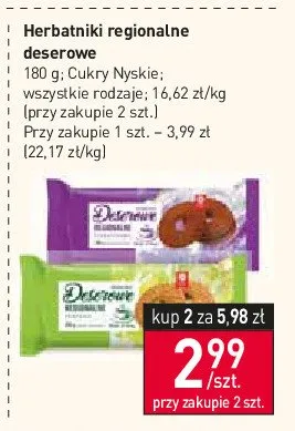 Cena produktu r贸偶ni si臋 w zale偶no艣ci od wybranego sklepu. Niestety nie posiadamy danych o aktualnych promocjach, jednak w艣r贸d archiwalnych ofert Herbatniki czekoladowe Cukry nyskie kosztuje od 2,99 z艂.