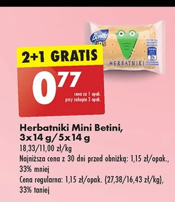 Cena produktu r贸偶ni si臋 w zale偶no艣ci od wybranego sklepu. Niestety nie posiadamy danych o aktualnych promocjach, jednak w艣r贸d archiwalnych ofert Herbatniki mini betini Bonitki kosztuje od 0,77 z艂.