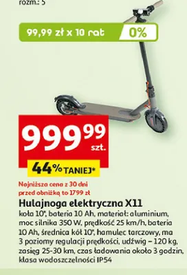 Cena produktu r贸偶ni si臋 w zale偶no艣ci od wybranego sklepu. Produkt Hulajnoga elektryczna x11 mo偶esz kupi膰 w promocji ju偶 od 749 z艂 do 1299,99 z艂. Najta艅sza oferta, jak膮 mamy w naszej bazie jest z sieci Auchan. Hulajnoga elektryczna x11 kosztuje aktualnie 749 z艂. Zobacz ofert臋