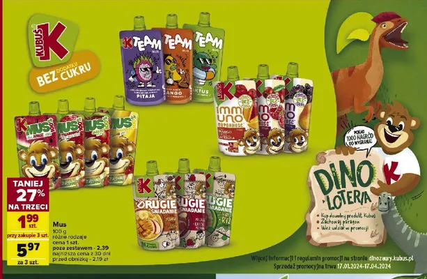Cena produktu różni się w zależności od wybranego sklepu. Niestety nie posiadamy danych o aktualnych promocjach, jednak wśród archiwalnych ofert Jabłko + ryż + cynamion Kubuś drugie śniadanie kosztuje od 1,99 zł do 2,29 zł.