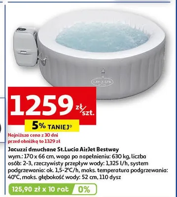 Cena produktu r贸偶ni si臋 w zale偶no艣ci od wybranego sklepu. Niestety nie posiadamy danych o aktualnych promocjach, jednak w艣r贸d archiwalnych ofert Jacuzzi ogrodowe lucia 170 x 66 cm LAY-Z-SPA kosztuje od 1259 z艂.